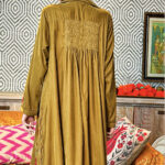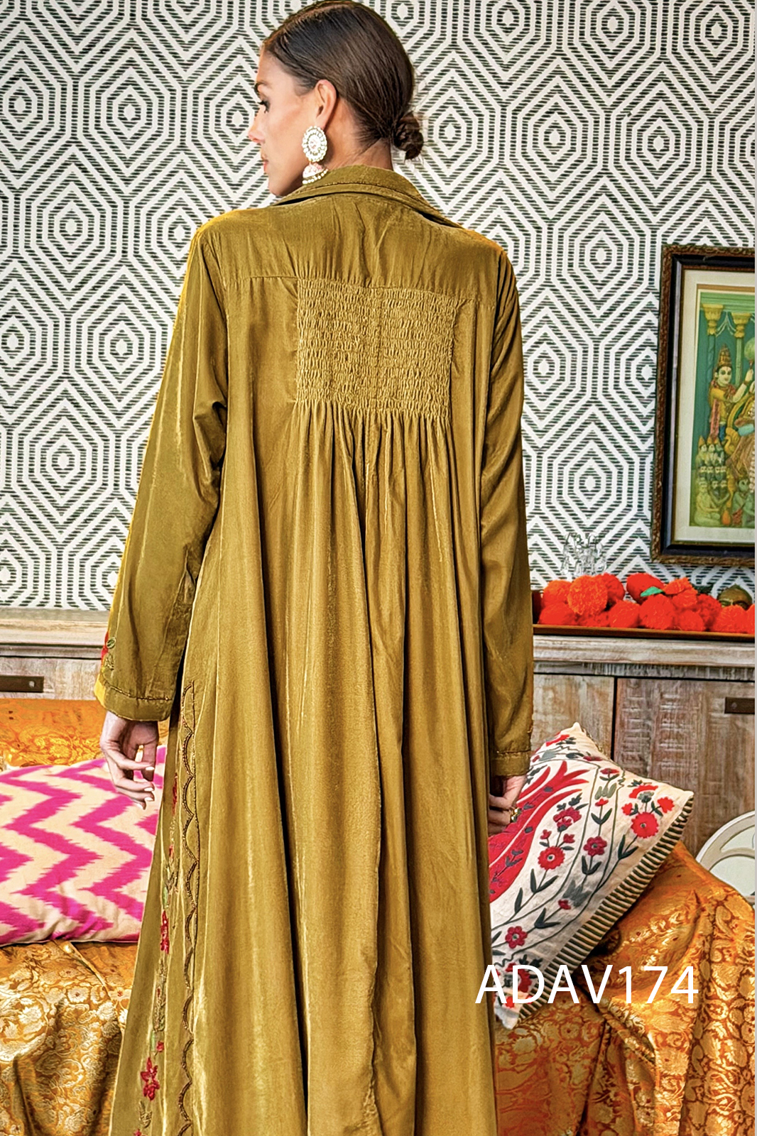 Details: A-line velvet kaftan with dome button closure from neckline to hem, gathered front and back with elastic, and hand-beaded accents at collar, chest, sleeve cuffs, and side panels
