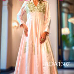 The chest and back of this magnificent kaftan shimmer with intricate zardozi embroidery, sequins, and delicate beadwork, creating a regal focal point. The mirror-work motifs adorning the front and back skirt panels catch the light with celestial brilliance, while the light-gold scalloping design at the sleeve openings adds a touch of refined charm. Designed for both beauty and comfort, the side seam zipper has been thoughtfully concealed to preserve fluidity, and a net fabric inner lining enhances the skirt’s graceful flow with every movement.