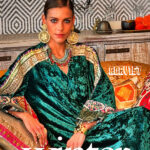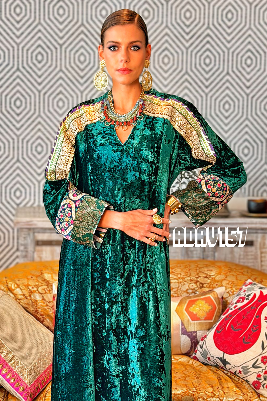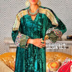 This teal silk velvet kaftan is a tactile symphony. From shoulder to cuff, it carries a cascade of intricate embroidery, echoing floral and geometric motifs. The sleeve cuffs bloom with a vibrant multi-color print, framed by a slender green stripe piping that adds rhythm and refinement. The velvet itself is lush and weighty, with a gentle sheen that catches light like moonlight on moss.