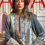 Crafted from sumptuous silk velvet, this kaftan has intricate embroidery graces the neckline, cuffs, and yoke edge. Golden piping traces the cuff edges like sunlight catching on dew, while the U-shaped panel of grey floral brocade blooms at the yoke, adding depth and poetic contrast creating a harmonious interplay of green and blue prints across the body evokes a serene garden.