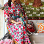 Details : Intricate embroidery & sequins work at collar & sleeve with multi-color stripe at neckline and elasticated cuffs. Open front button down, hand block print at front and floral boota on back panel and red green ikat design at sleeves. Light pink color pocket with round multi-color embroidery design framed by golden stripe at top and scallop dori work at pocket bottom. Golden brocade fabric at the bottom of the dress.