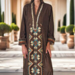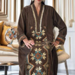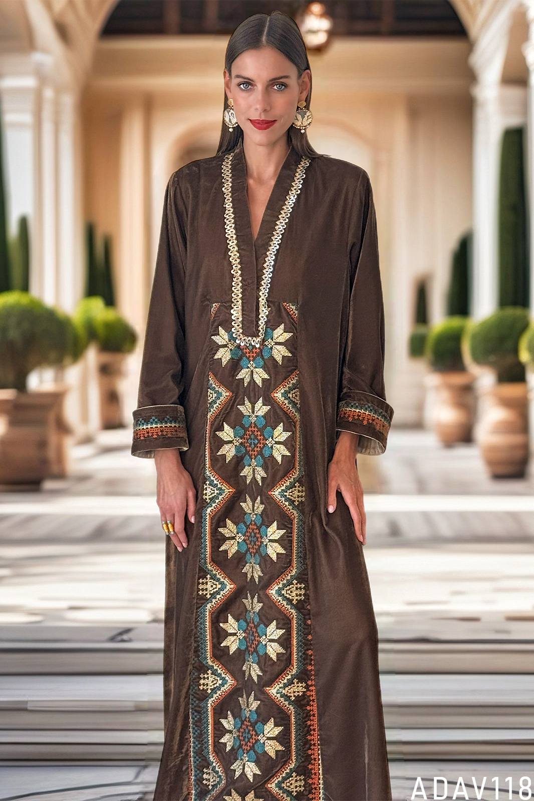This kaftan is crafted from sumptuous silk velvet. The neckline is adorned with intricate handwork. Delicate embroidery graces the center front and sleeve cuffs, blooming in subtle motifs that echo tradition with a modern hush.