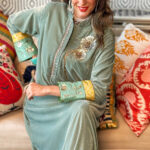 This velvet kaftan unfolds in soft elegance. The neckline and cuffs are kissed with delicate embroidery, tracing graceful patterns . At the sleeves, panels of yellow brocade bloom like sunlight—framed with precise piping that adds a tailored finish. The chest bears intricate handwork that anchors the garment in artisanal legacy.