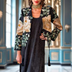 This combination comes with a stylish jacket featuring detailed embroidery on the front and sleeves, made with fine linen and shimmering zari thread. The jacket also includes shoulder pads and tassel that drapes down like a quiet exclamation—elegant, deliberate, and full of flair. The inner dress has a beautiful silk suede fabric with spaghetti strap that is thin and delicate that give outfits a light, elegant look. A hidden zipper at the back ensures a smooth fit and clean finish.