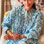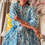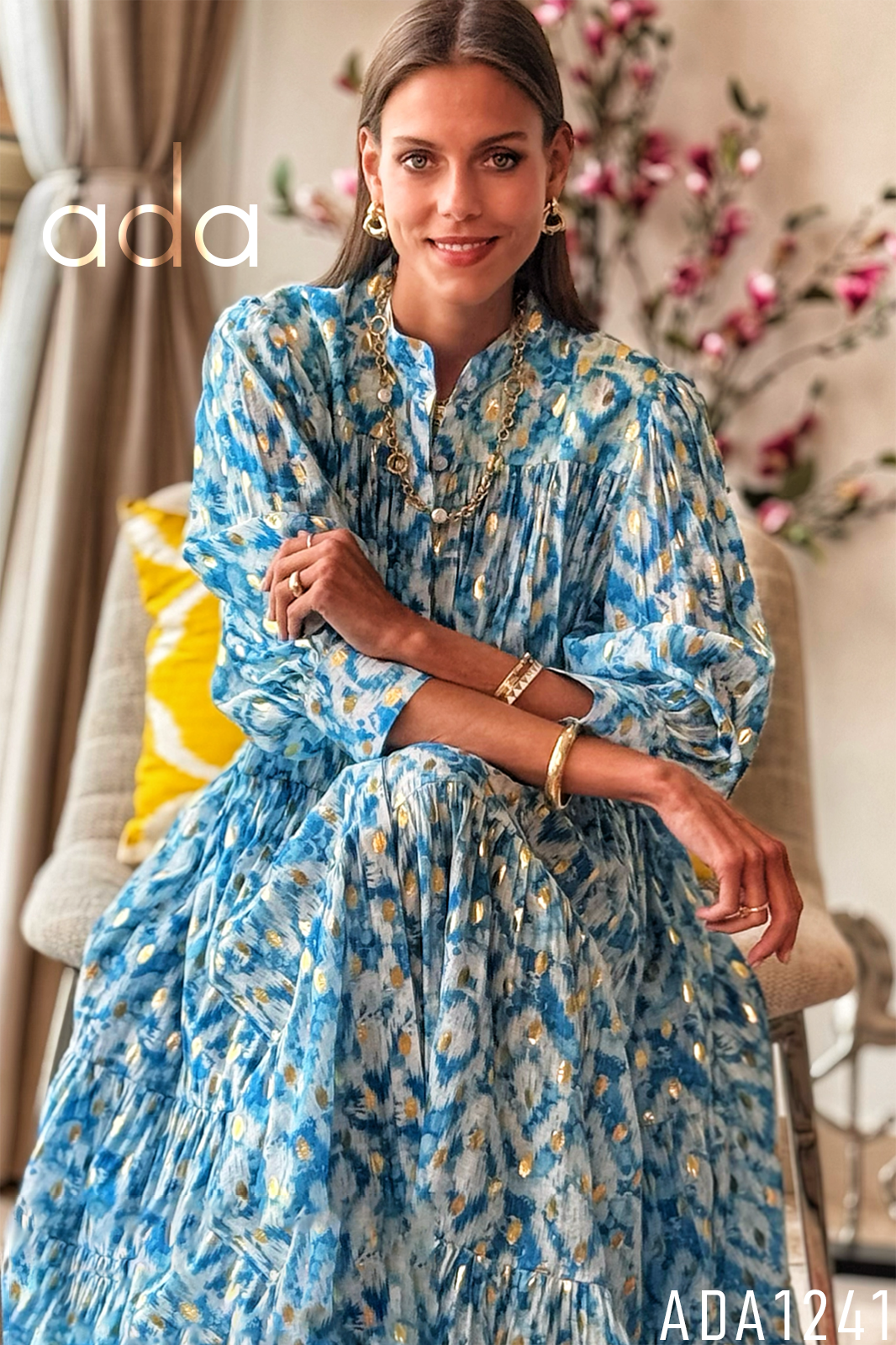 A cotton kaftan with a touch of silk feel with beautiful panel gathering that breathes the poetry of the wind—this button-down front masterpiece unfurls in vibrant waves of cerulean, alabaster, and golden hues, like sunlight cascading through Mediterranean waters. The abstract floral motifs ripple across its supple fabric, each bloom a stanza in nature’s unwritten verse.