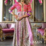 The upper body of this silk kaftan glows in vibrant fuchsia pink, gracefully transitioning into a soft pink lower body—creating a striking visual harmony. Intricate floral embroidery blooms across the front and back yoke and sleeves, delicately accented with shimmering sequins. A refined neckline is framed with purple and gold striped piping, adding a regal touch. Designed with a concealed side-seam zipper for a sleek look and improved fit, the front and back feature alternating panels adorned with silver sequin work, lending depth and dimension to the silhouette. At the hem and cuffs, gold sequins dance alongside purple and gold stripes, completing the piece with a flourish of opulence.