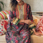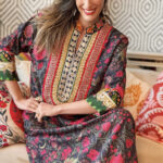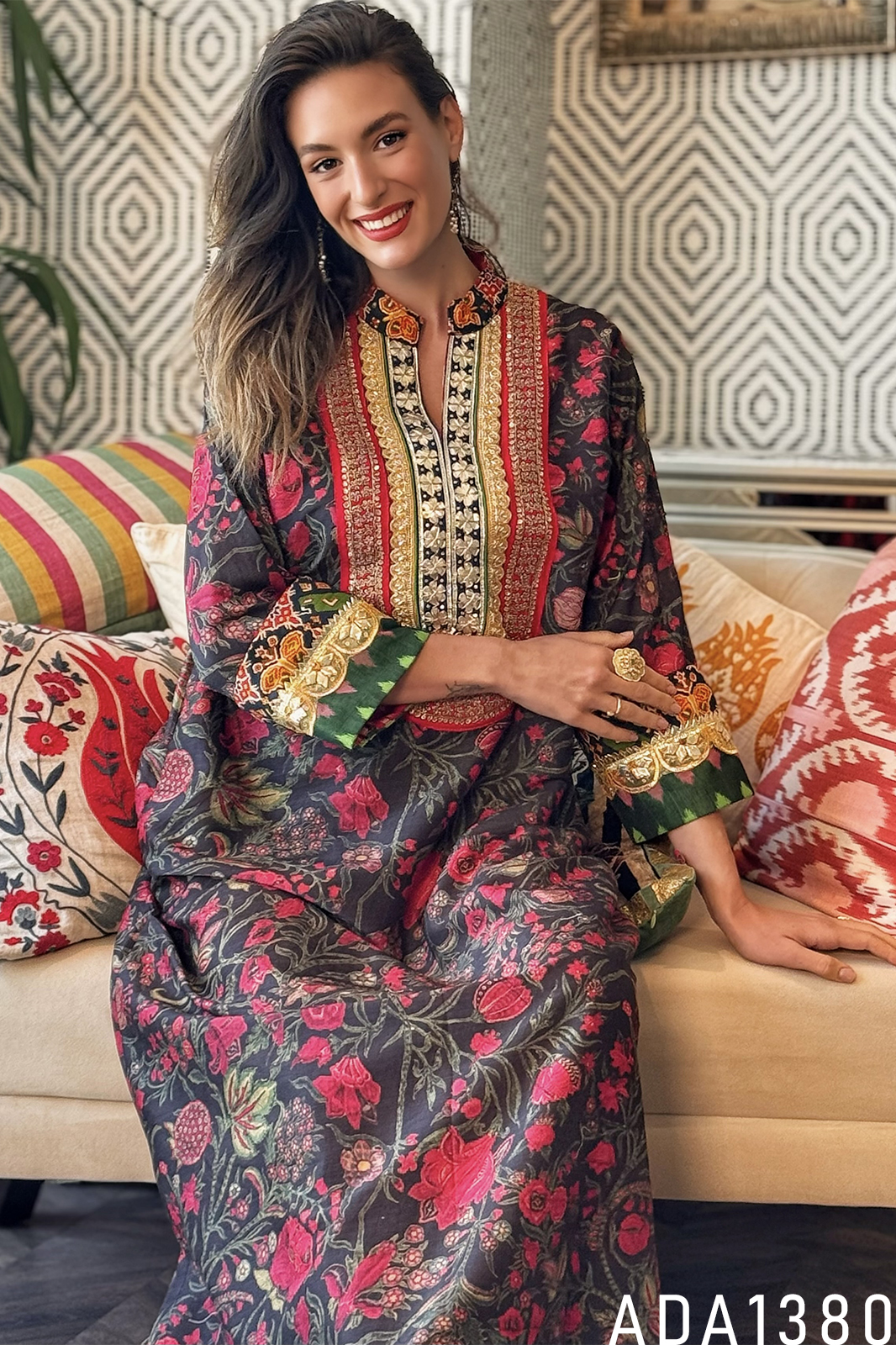 A graceful silk kaftan that graces the neckline and sleeve cuffs with delicate embroidery. The floral print blooms across the surface in soft, painterly strokes. The silk itself is cool to the touch, with a fluid drape that glides over the skin like a breeze. The hand feel is smooth and supple.