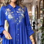 This cotton-blend kaftan features a front-open button-down silhouette that flows with ease and intention. The neckline is adorned with intricate handwork—delicate sequins and beads shimmer subtly, catching light and admiration alike. Gentle gathers at the waist lend a soft structure, enhancing movement while preserving comfort. Sleeves are designed with turn-up tabs for a relaxed, versatile finish, and a separate inner lining ensures graceful layering and a polished drape.