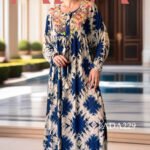 A kaftan featuring an intricate embroidery on the yoke that captivates the eye meticulously woven. The kaftan’s fabric is adorned with a mesmerizing pattern of deep blue and white, creating a striking contrast that enhances its elegance.