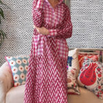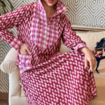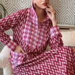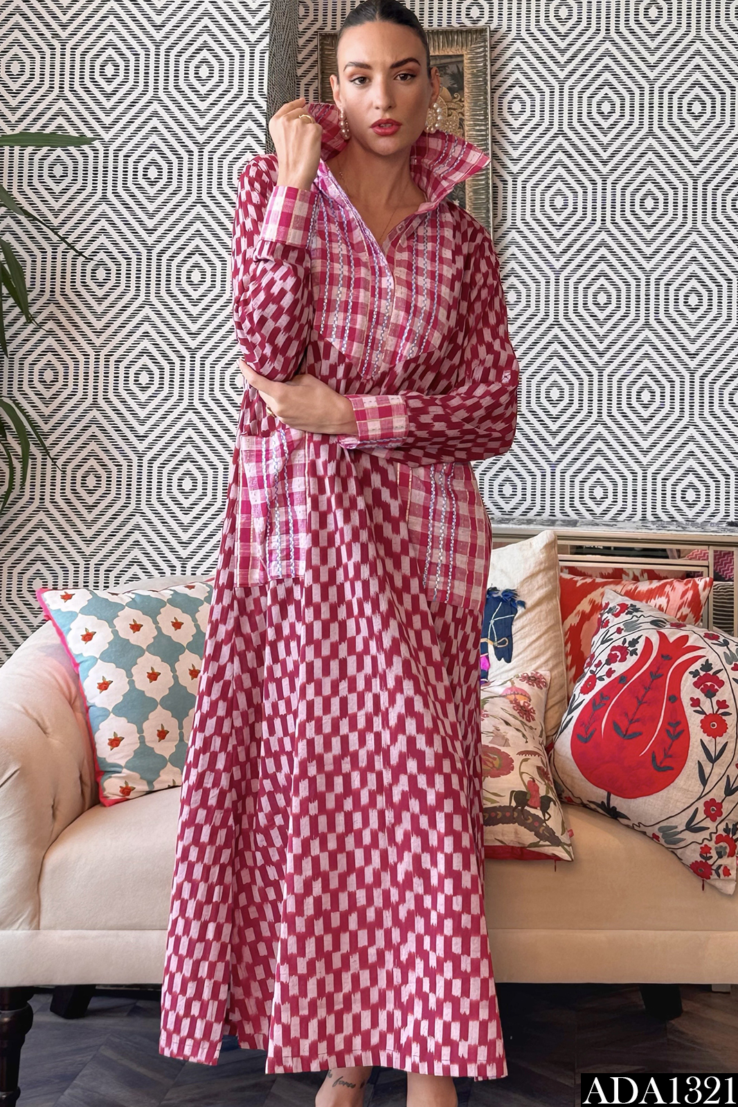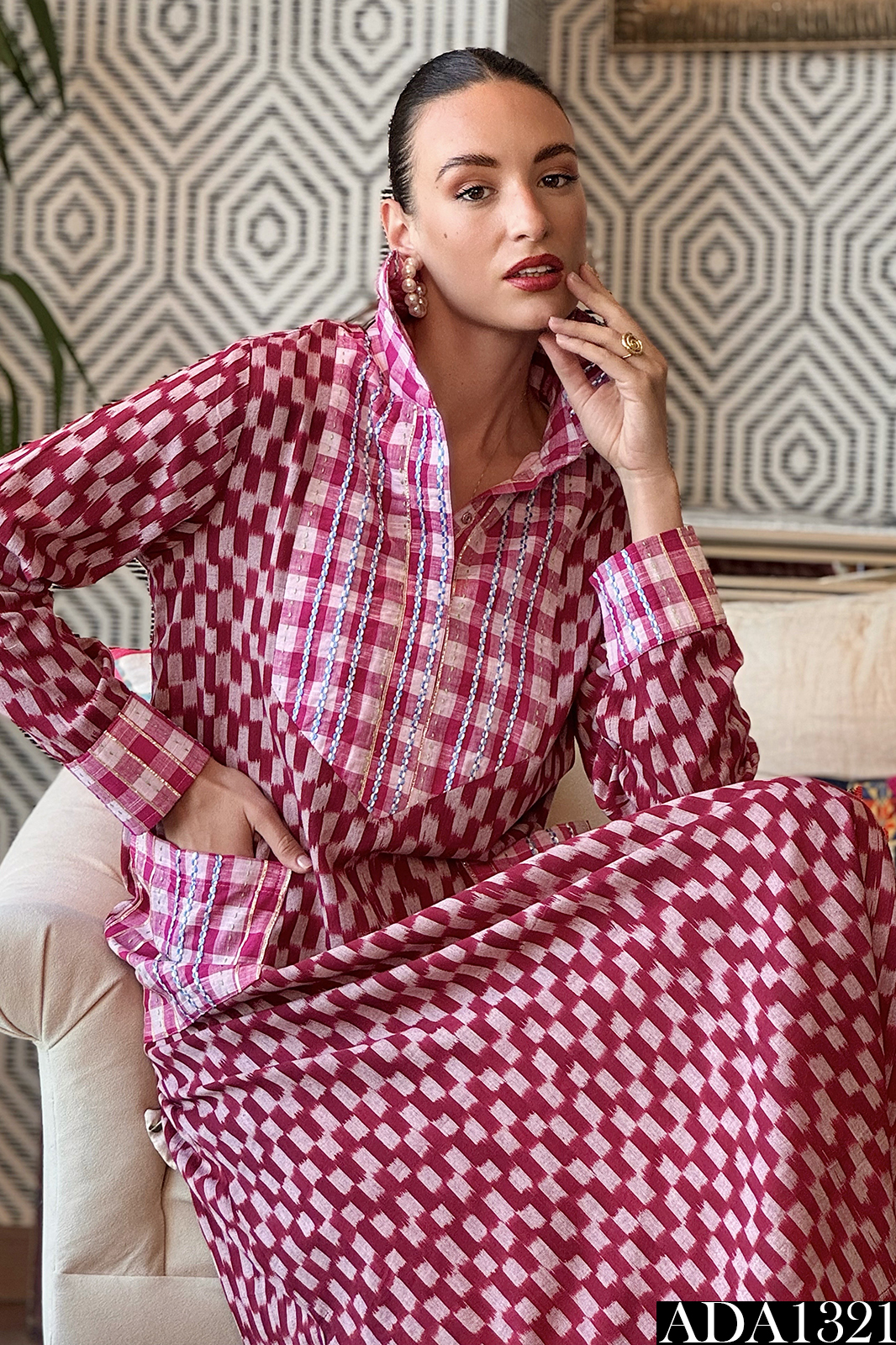 This cotton kaftan is a quiet celebration of structure and softness. Tailored with precision, it features jacquard-checked fabric accents on the arm collar, cuffs, yoke, and pocket—each element adding a subtle rhythm to the garment’s flow. The body features a ikat pattern, forming a structured yet fluid grid that elongates the silhouette.