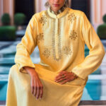 A radiant masterpiece in luxurious lurex stripe fabric, this kaftan embodies elegance with a shimmering hand feel that catches the light at every angle. The neckline and center back are adorned with intricate sequins and beadwork, meticulously hand-applied to create a regal focal point. The sleeves are finished with a golden scallop design at the cuffs, adding a refined touch of opulence.
