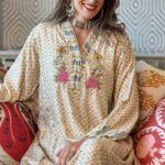 Wrapped in the grace of silk threads, this kaftan evokes a gentle opulence—a symphony of texture and refinement. Around the pintuck neckline blooms a delicate garden of handwork embroidery in blush pink and soft golden tones with kingri lace at neckline’s edge, reminiscent of morning petals touched by light.