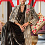 This bisht evokes timeless grandeur through its interplay of texture and detail. Draped in dark grey, it features a striped jacquard net jacket that glimmers with subtle sequins and ornate patchwork at the chest—each element meticulously placed to create a rich, regal silhouette. Beneath, a simple silk velvet inner dress offers a soft contrast, allowing the jacket’s craftsmanship to command attention.