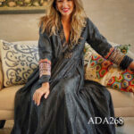 Details : Hi-neck dress fabric with embroidery & sequins work. Light gold stripe brocade fabric at neckline and allover dori embroidery with gold sequins work. Diagonal shape embroidery at upper body and sleeves while vertical shape at skirt panel with multiple panels. Criss cross zari embroidery at bottom framed by blue piping. Intricate multi-color thread embroidery and sequins work at the sleeve cuffs.