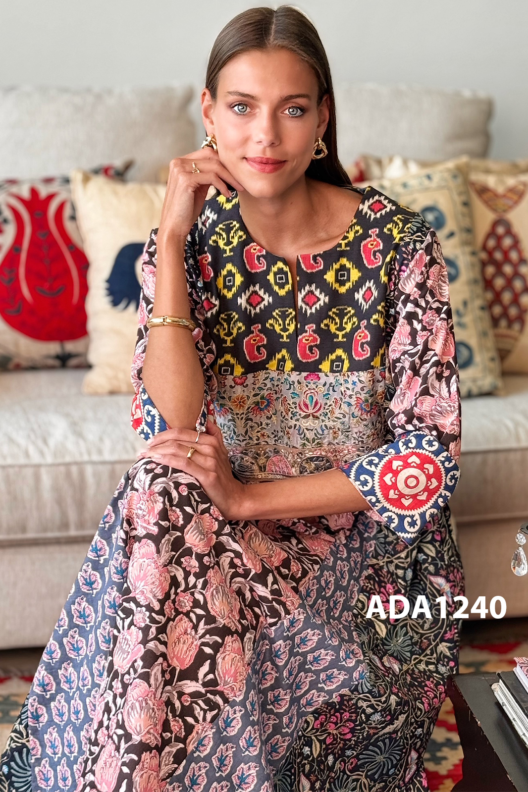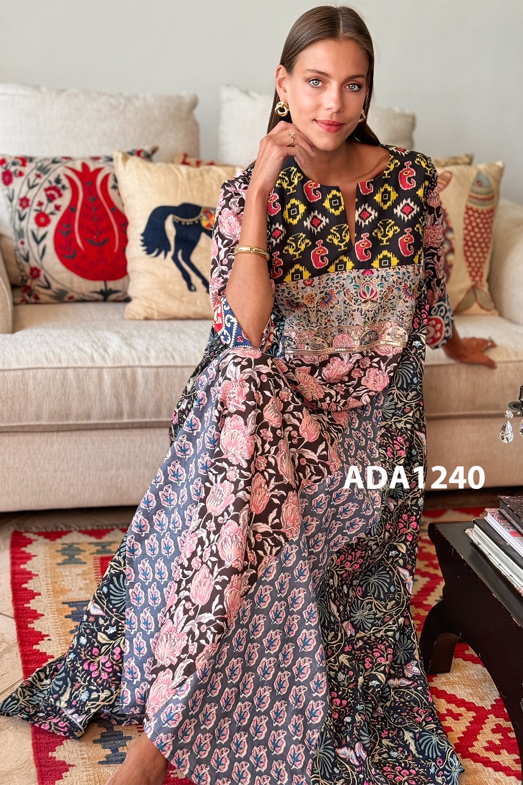 This cotton kaftan is a celebration of craftsmanship and color. At its heart lies a beautifully embroidered front panel, where threads of tradition meet contemporary flair. The embroidery—rich in detail and texture—adds depth to the garment’s already captivating palette of florals and geometric motifs. Designed for effortless elegance, the kaftan drapes gracefully while offering breathable comfort, making it perfect for both relaxed gatherings and statement moments.