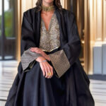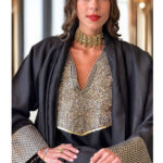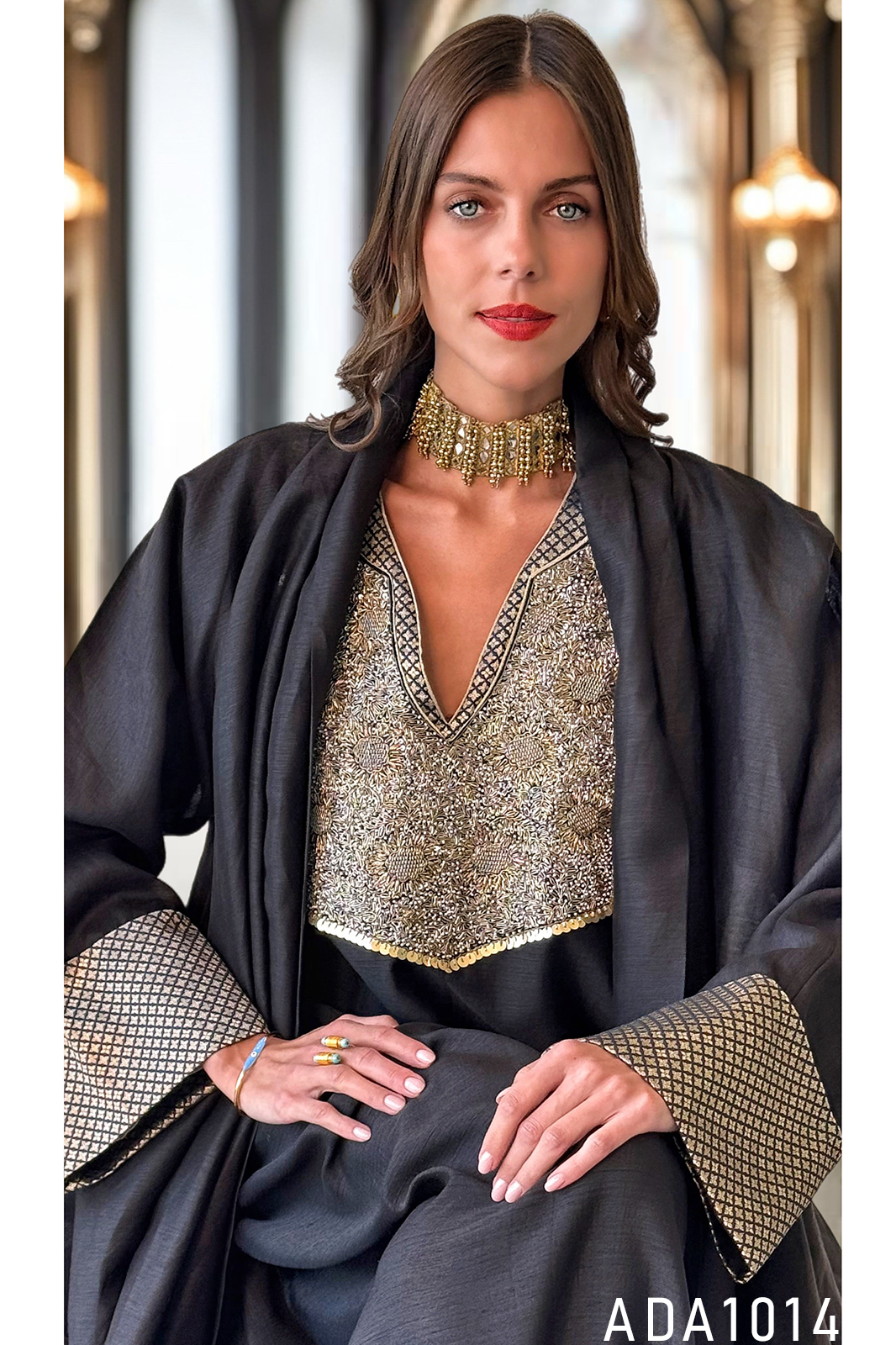 This silk bisht unfolds in quiet grandeur, featuring a neckline adorned with brocade. The yoke has some delicate handwork, a piece that speaks softly, yet leaves a lasting impression. The jacket’s cuffs echo the dress’s neckline splendor, framed in brocade that adds structure and ceremonial grace.
