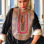 The velvet Kaftan celebrates the art of refined embellishment with its intricate embroidery at the neckline, framed by a bold red piping that adds a touch of regal contrast. The sleeves are finished with light brocade cuffs, turned up to reveal delicate embroidery that speaks to the kaftan’s layered sophistication. Designed for those who value heritage craftsmanship and modern elegance.