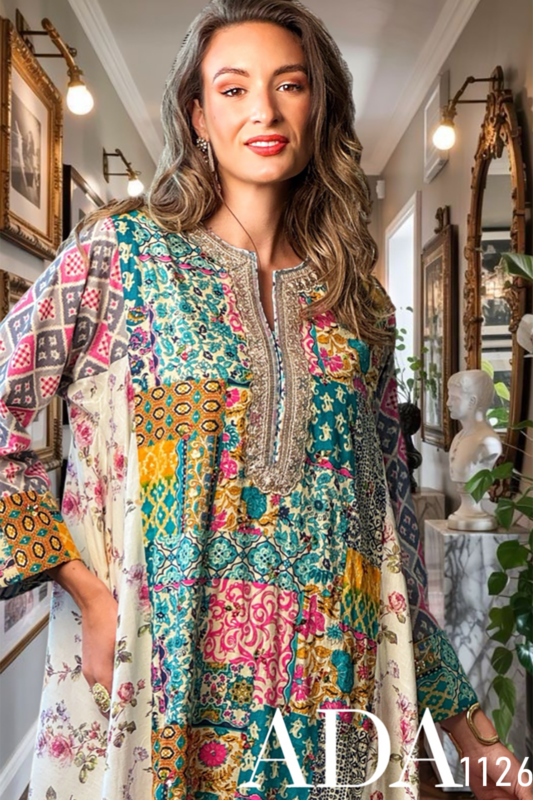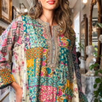 Indulge in the opulence of this luxurious cotton silk kaftan. The graceful silhouette of the kaftan flows effortlessly, creating an ethereal presence. The neckline, a true masterpiece, is adorned with exquisite embroidery crafting a mesmerizing pattern.
