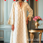 This off white kaftan flows like dawn’s first light, adorned with golden embroidery that glimmers softly with every movement. The V-shaped neckline, kissed with delicate embellishments, frames the wearer with quiet grace, while the long sleeves and hem bloom with intricate motifs.
