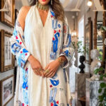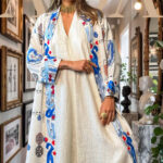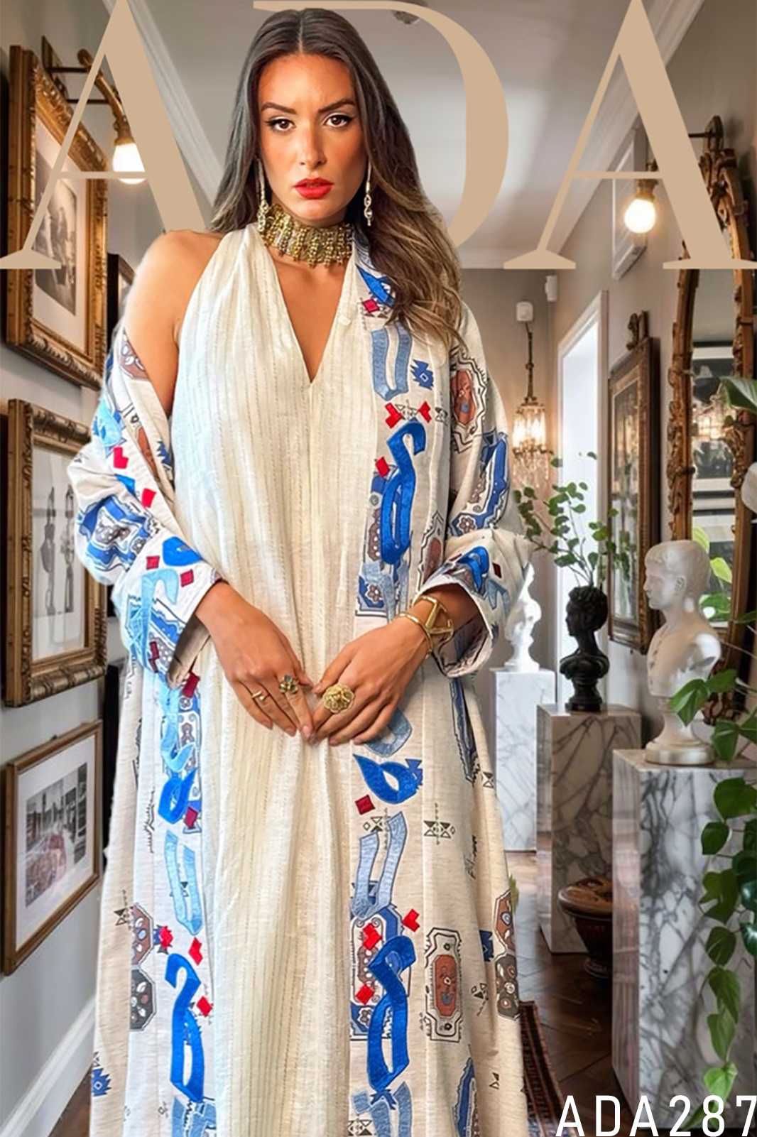 Draped in ethereal linen, this bisht with its structured jacket and flowing dress embodies effortless grace. The jacket is adorned with intricate embroidery, where sapphire, ember, and sand-hued threads converge in rhythmic patterns, evoking echoes of heritage and artistry.