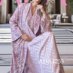 This bisht is a symphony of elegance, where flowing layers of soft mauve embrace the body like twilight’s gentle veil. White floral embroidery blooms across its surface, echoing gardens of memory and grace. Beneath, a subtle striped inner in blush and gold glimmers like hidden poetry, adding depth and quiet opulence.
