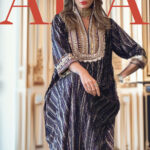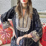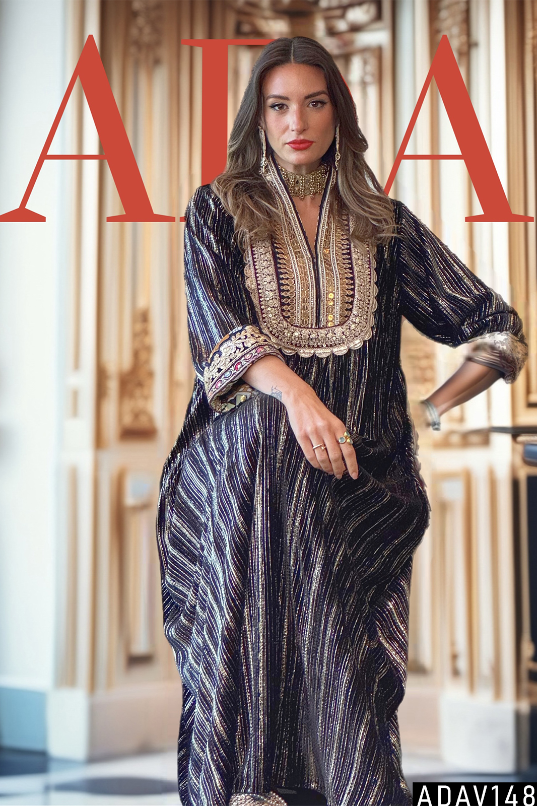 Crafted from black and golden crinkle-stretched velvet, this kaftan shimmers with texture and depth, catching light like a secret. The high collar silhouette evokes regal restraint, while intricate hand embroidery blooms around the neckline and cuffs—each stitch a testament to artisanal devotion.