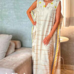 Adorned with charming yellow glass work embellishments, this dress is perfect for your taste.The subtle pattern of horizontal dotted lines in light brown adds a delicate touch, this dress promises comfort and elegance.
