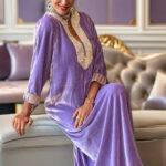 A silk velvet kaftan in a shade of lavender twilight, quiet and regal. The neckline is adorned with delicate off-white embroidery and handwork while the striped cuffs shine like golden stars. Each stitch is a sigh of craftsmanship, subtle yet intentional, drawing the eye without demanding it.