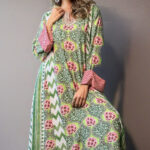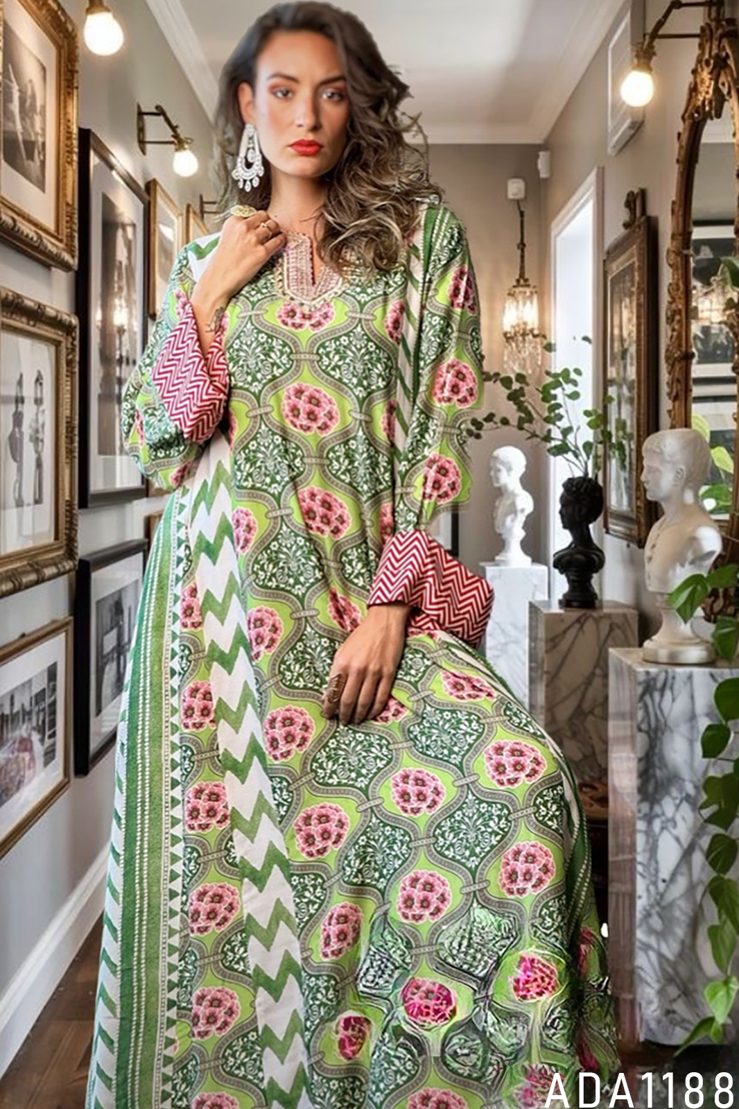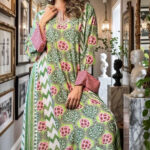 A symphony of flowing viscose drapery adorned with intricate hand work on the neckline, this kaftan is a testament to artisanal craftsmanship. The luminous interplay of green, pink, and white patterns weaves a tale of botanical elegance.while the delicate embroidery gracing the neck elevates its charm with timeless finesse.