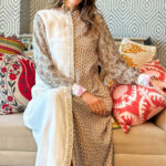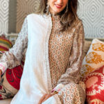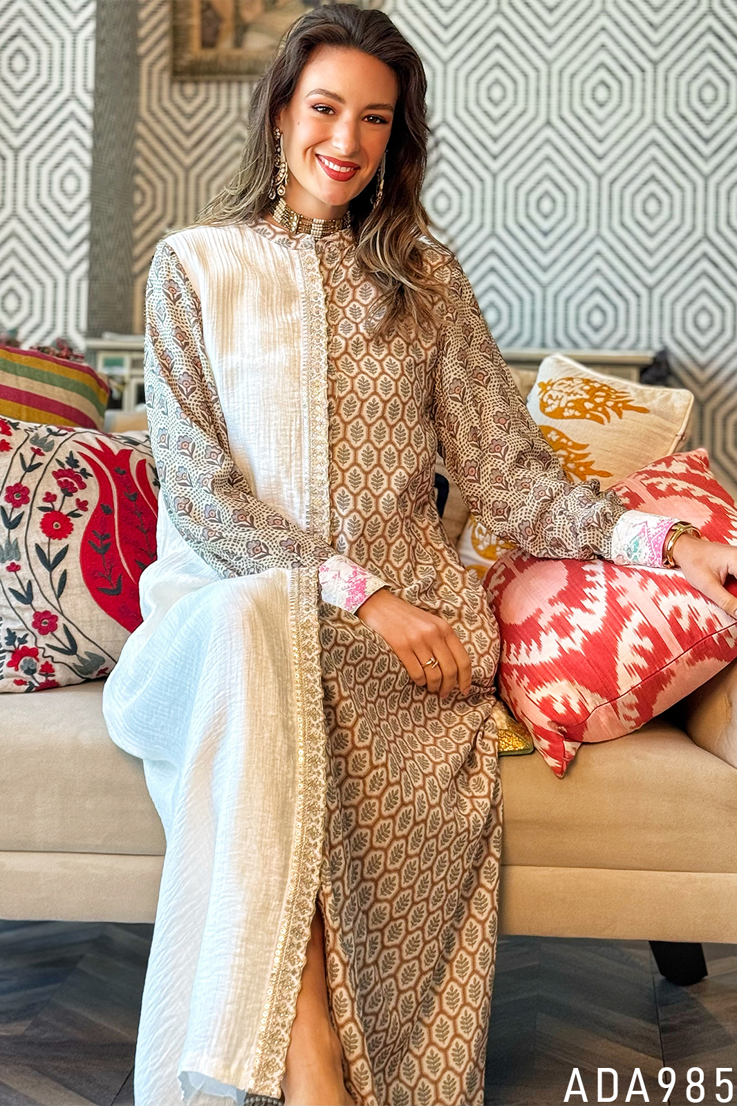 This enchanting silk kaftan is a testament of starlight. The centerpiece is its exquisite placket embroidery—a refined cascade of intricate detailing that enhances the kaftan’s sophistication. One side features a mesmerizing leaf-like motif while the opposite side embraces simplicity with an understated textured design.
