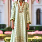 This silk kaftan’s neckline is adorned with delicate embroidery, framed by fine piping that adds a tailored finish. Matching embroidery flourishes along the centre of bottom hem, creating a harmonious balance of detail and flow. The body features a subtle zig-zag brocade pattern, while the side panels in plain silk offer contrast and clarity, allowing the central design to breathe.