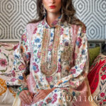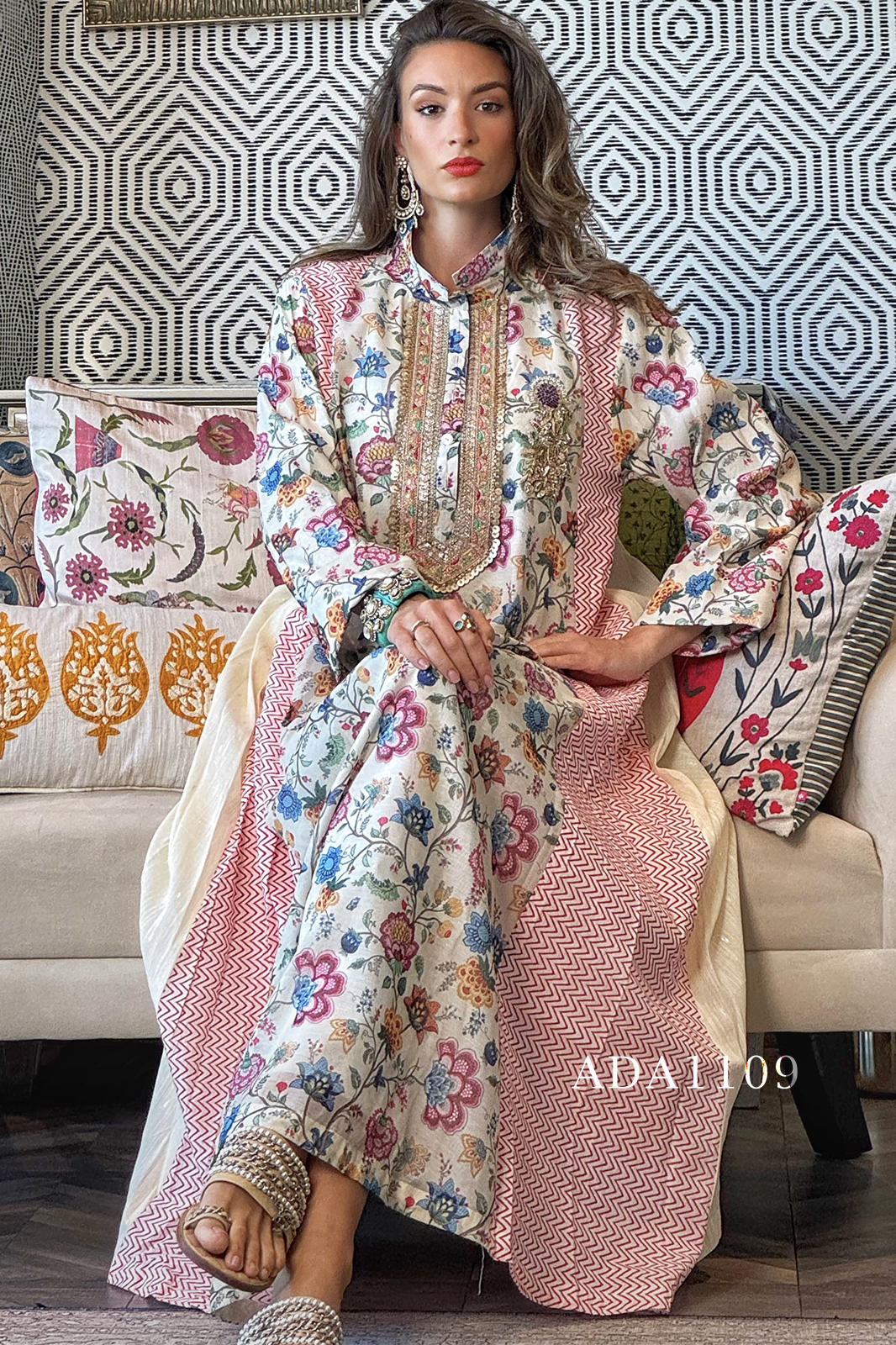 The beauty of this kaftan lies in its exquisite combination of luxurious silk and soft cotton. The main fabric, crafted entirely from silk while the side panels, made from cotton, add a touch of comfort and contrast. The neckline is adorned with elaborate gold embroidery and embellishments with left breast pocket side adorned with delicate embroidery.