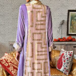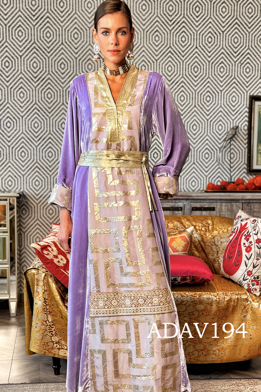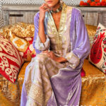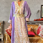 The kaftan is crafted from sumptuous silk velvet, rendered in ethereal light purple that shimmers with quiet majesty. Its flowing silhouette is elevated by intricate embroidery with squin work, offering a regal yet graceful presence. The fabric itself carries a gentle sheen, while its velvet texture adds depth and richness that feels both regal and intimate.