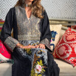 This cotton kaftan glows with elegance. The yoke and cuffs are adorned with brocade fabric blooming in floral motifs. Beneath the yoke, intricate handwork unfurls like a secret garden, while the center panel features delicate embroidery that draws the eye with quiet sophistication. Floral piping traces the neckline and cuff edges, adding a soft flourish. The body is wrapped in an allover striped fabric, creating a graceful rhythm.
