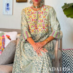 A kaftan that dances with every glance. It celebrates the timeless elegance of multiple ikat prints. The yoke bursts with vibrant floral motifs dancing across the fabric like a garden in bloom while the lower half transitions into blue and white geometric ikat. The sleeves are colorful yet structured, they feature a layered ikat composition.