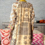 Details : Green striped collar, delicate sequin embroidery at neckline with contrast pink piping, yellow paisley motif at center front flanked by floral side panels, tile-print at back panel.