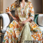 This exquisite cotton silk kaftan features a lush floral print in shades of orange, green, and aqua that dances across the fabric. The neckline is adorned with intricate embroidery and delicate handwork, framed by soft pink piping and shimmering gota accents for a regal touch. A panel of natural-hued fabric graces the center front, embellished with golden zari embroidery that adds depth and heritage charm. The bottom panel showcases light golden brocade, lending a subtle opulence to the silhouette. Sleeves are finished with a graceful flower boota print and a gleaming gold stripe at the turn-up, completing the look with understated grandeur.
