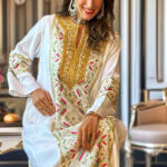 Step into a world of elegance and grace with this exquisite silk kaftan featuring a stunning gold & multi color threaded royal embroidery adorned on the neckline with the front panel, a masterpiece of intricate embroidery of vibrant patterns that stand out beautifully against the plain white sides.