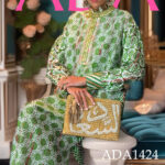 A tapestry of heritage and artistry, this kaftan is a symphony of prints and embellishments. The neckline and collar shimmer with intricate zari embroidery, sequins catching the light like scattered stars. At the sleeve cuffs, stripes of gold, green, and off‑white echo regal tradition, while the front unfolds in a batik story, the back dances with bold zig‑zag geometry, and the sleeves bloom with delicate boota motifs.