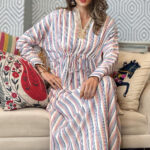 Adorned with vertical multicolor stripes, this cotton kaftan blends with everyday ease. The neckline features intricate embroidery, delicate yet striking, adding a touch of heritage refinement. A functional drawcord cinches the waist, creating soft, gathered contours that flatter the silhouette without compromising comfort. Thoughtfully designed sleeve have functional cuffs, allowing for graceful movement and styling versatility.