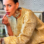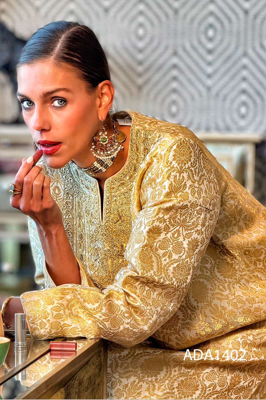 A symphony of grace and grandeur, this brocade kaftan is crafted from luxuriously textured fabric in radiant gold and soft off-white hues. The neckline is adorned with intricate dori embroidery, delicately embellished with shimmering sequins and beads, creating a focal point of refined opulence. Flowing with effortless charm, this piece embodies timeless sophistication and ceremonial allure.