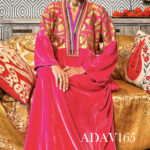 Crafted from sumptuous fushia silk velvet, this kaftan radiates regal charm with its intricate embroidery adorning both the front and back of the upper body. The neckline is a focal point of artistry, featuring delicate golden threadwork with sequin framed by a striking gold-fuchsia stripe piping. A multicoloured check fabric at the neckline adds a playful contrast, harmonizing beautifully with the body’s rich hue. Designed to embody grace and grandeur, this piece is a celebration of timeless elegance and meticulous detail.