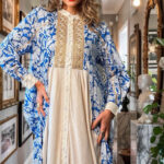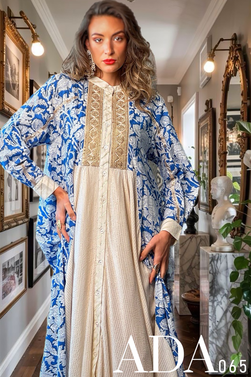 Wrap yourself in the soft embrace of pure cotton with this enchanting kaftan. The meticulously embroidered yoke adds an exquisite accent, a masterful play of needle and thread that transforms the garment into a canvas of art.