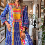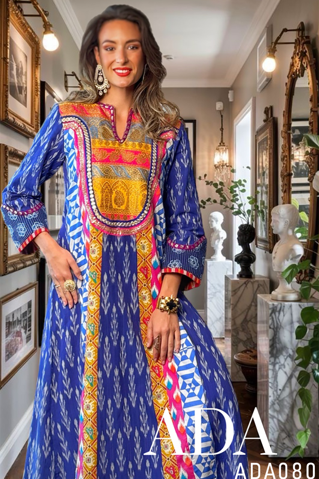 Step into the spotlight with this breathtaking cotton dress with its yoke being brocade. It features a rich navy blue base adorned with a mesmerizing blend of geometric and floral designs in shades of red, yellow, and white.
