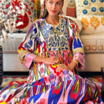 This cotton kaftan is a vision woven from the fabric of dreams with its yoke embroidered from peacock pattern. Like sunlight fractured through a prism, its hypnotic ikat patterns pulse with a symphony of crimson, cobalt, emerald, and gold. The sleeves, kissed by delicate gold accents and floral motifs, billow like celestial wings, lending a quiet power to the wearer.