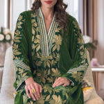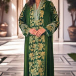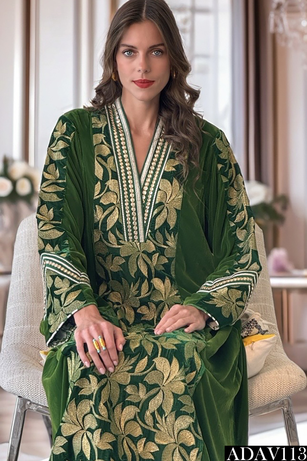 Crafted in plush velvet, this velvet kaftan features a delicately embroidered leaf motif cascading down the center panel, mirrored in graceful symmetry along the sleeves. The neckline and cuffs are adorned with threaded mirrorwork embroidery, catching light with quiet brilliance.