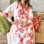 This off-white silk kaftan blends comfort with refined detail. The neckline, structured yet soft, adds a touch of sophistication. A printed fabric runs down the center panel and sleeves, creating visual balance and a sense of flow. The fabric itself has a smooth, luxurious hand feel, making it as pleasant to wear as it is to admire. At the back, a subtle gather held by elastic thread adds gentle shape and movement. Silver-striped fabric at the sleeve cuffs offers a delicate contrast.