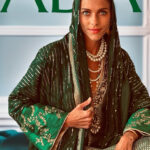 A bisht that speaks in shimmer and silhouette—this ensemble pairs a richly embroidered jacket with a light jacquard dress, creating a harmony of texture and tradition. The jacket dazzles with all-over sequins and embroidery, while gold zari cuffs add a regal accent. A stripe motif along the neckline lends modern structure, framing the neckline’s delicate weavework. The inner dress forms a subtle diamond shape, contrasted by a striking Patola-inspired design at the back with masterful handwork on the neck—an homage to heritage with a contemporary twist. Completing the look is a separate scarf, drenched in sequins.