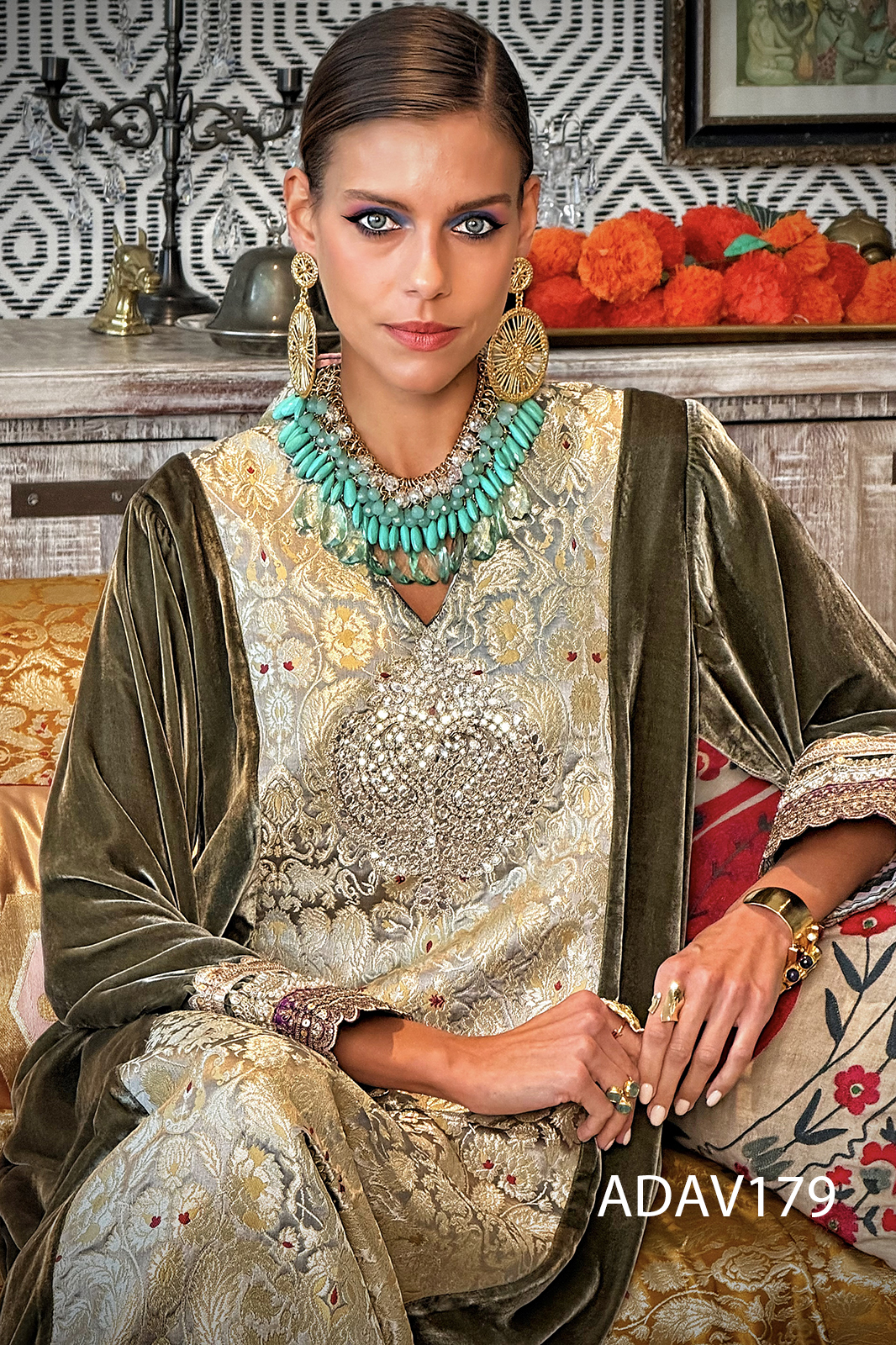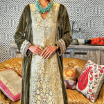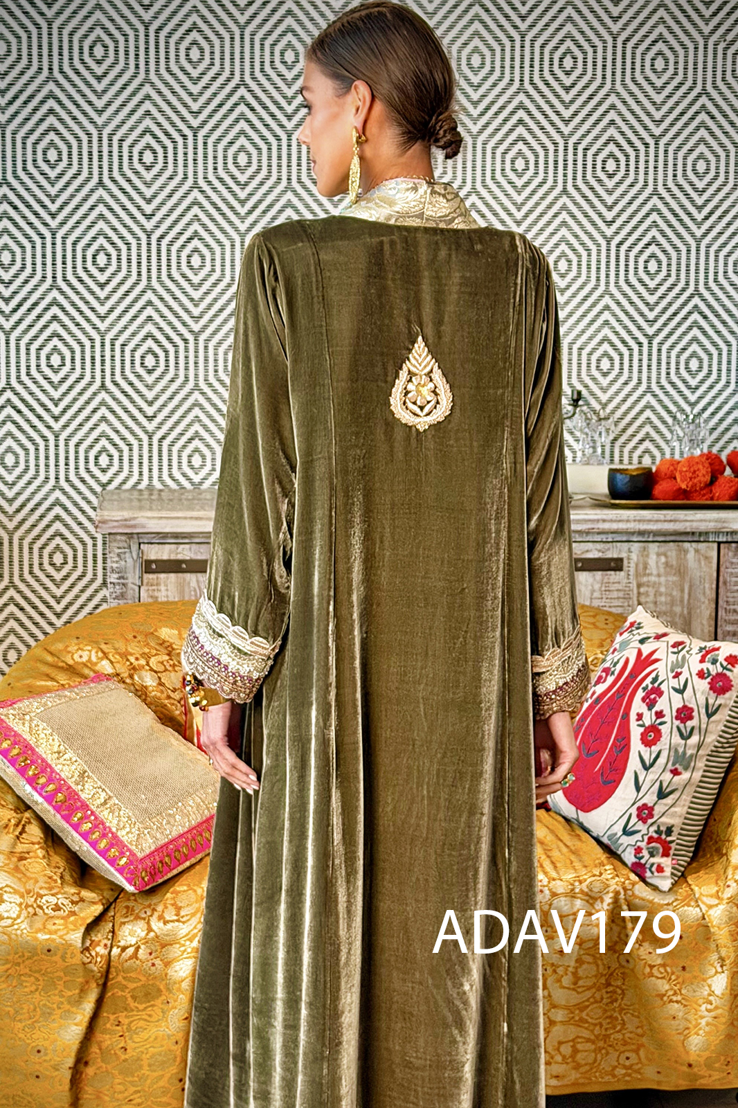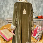 Step into opulence with this silk velvet kaftan. The centre front panel is adorned with sumptuous brocade fabric, radiating richness and depth. Just below the neckline, a meticulously embroidered patch glimmers with glasswork accents. At the back, a hand-crafted zardosi patch anchors the garment in artisanal tradition, offering a regal flourish. The sleeve cuffs are a canvas of intricate embroidery and handwork, echoing the kaftan’s dedication to detail.