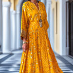 This luminous silk kaftan is adorned with allover delicate embroidery and shimmering sequins, creating a celestial glow across. The sleeves and center front feature diagonal sequins work that adds movement and rhythm to the design, while the cuffs are finished with intricate embroidery. A separate belt, also embellished with diagonal sequins, cinches the waist with grace, allowing the wearer to shape the garment to their mood.